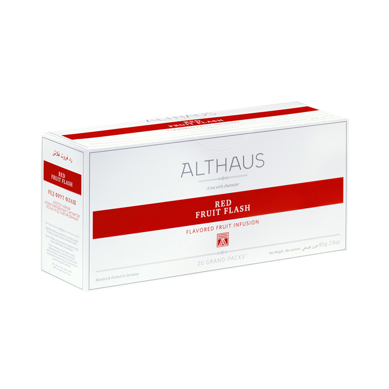 Чай Альтхаус Ред Фрут Флаш — это травяной фруктовый напиток, содержащий в основе гибискус (70%), ягоды бузины (20%), шиповник (5%), а также яблоко, листья клубники и натуральные ароматизаторы «Клубника» и «Ванильный крем». Он обладает ярким красным цветом и насыщенным ягодно-фруктовым вкусом с лёгкой кислинкой и сладкими ванильными нотками. Этот напиток не содержит чайных листьев, не содержит кофеина и отлично подходит для любителей фруктовых и ароматных чаёв.