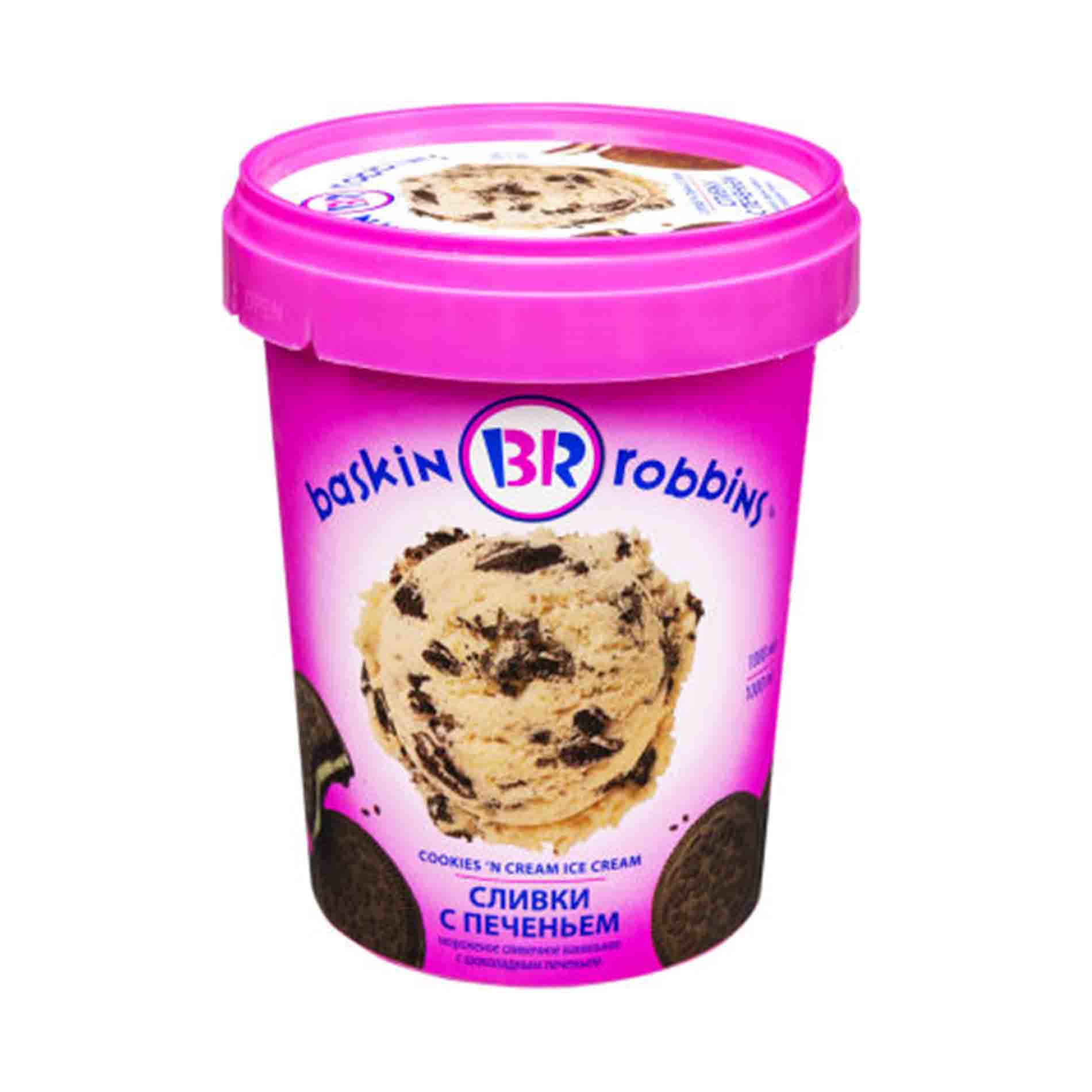 Мороженое BASKIN ROBBINS – натуральный продукт без заменителей молочного жира. Сливочное ванильное мороженое с шоколадным печеньем.