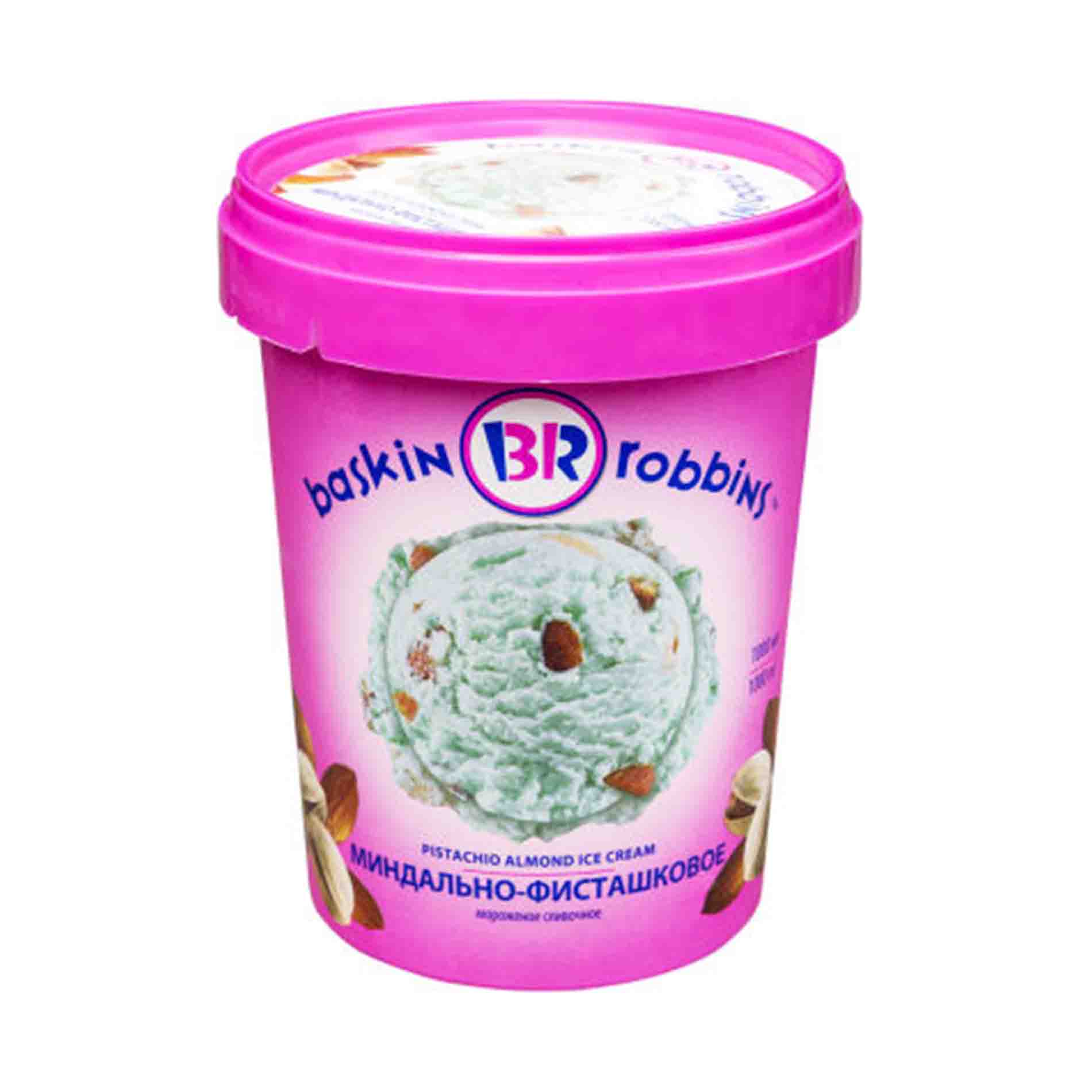 Мороженое BASKIN ROBBINS – натуральный сливочный продукт без заменителей молочного жира, с ароматом фисташек, с орехами миндаля.