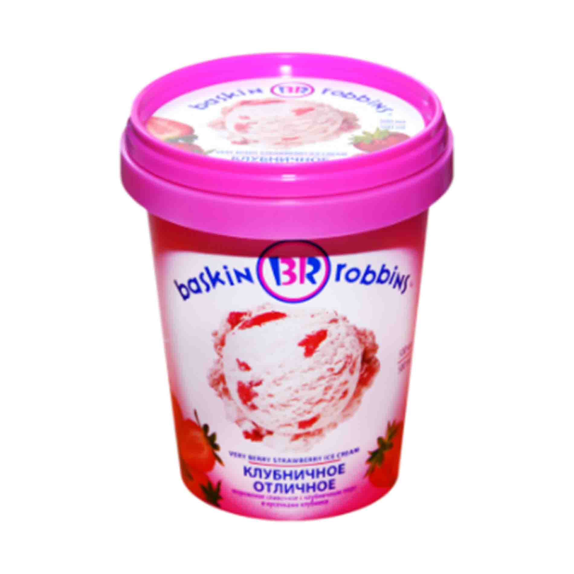 Мороженое BASKIN ROBBINS «Клубничное» без змж – сливочный десерт. В мороженое добавлены клубничное пюре и кусочки ягод.