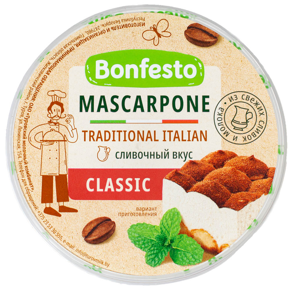 Сыр BONFESTO «Маскарпоне» 78% – мягкий крем-сыр с нежнейшим вкусом. Содержит белки, углеводы, калий, фосфор, витамины группы В и витамин А.