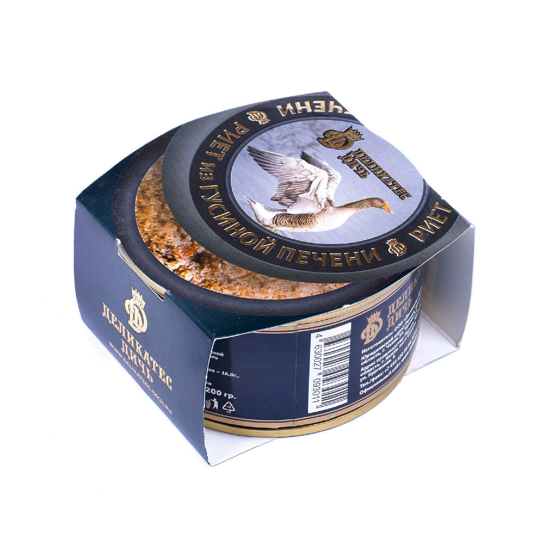 Состав: гусиная печень, куриная печень, мясо курицы, мясо индейки, мясной бульон, масло сливочное, эмульгатор Е415, соль поваренная пищевая, соль нитритная, сахар, загуститель Е 412, смесь перцев. Массовая доля мясных ингредиентов не менее 72%.