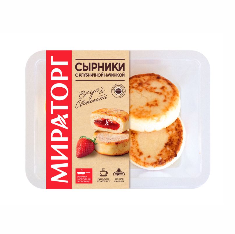 Отечественный бренд «Мираторг» предлагает начать свое утро с вкусных сырников с клубникой. Для приготовления блюда используется свежий фермерский творог. Мягкие сырники в удобной упаковке легко брать с собой на работу. Это сытный и полезный перекус.