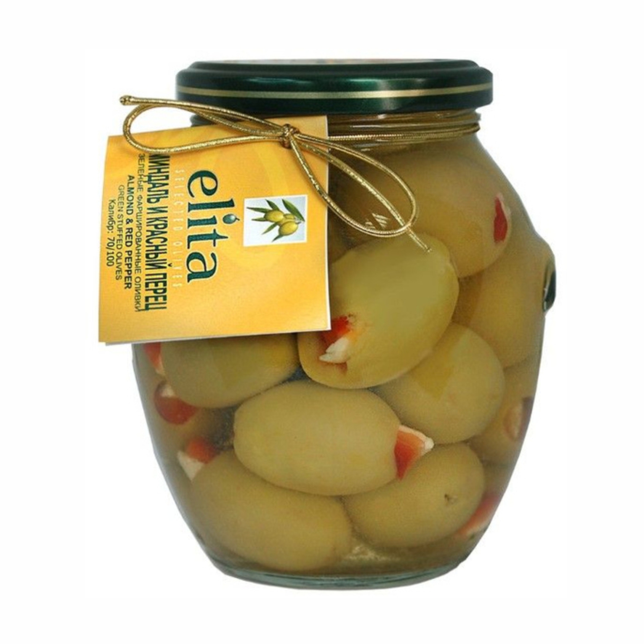Оливки зеленые фаршированные миндалем и натуральным красным перцем ELITA 395мл ст/б 1/6 Греция