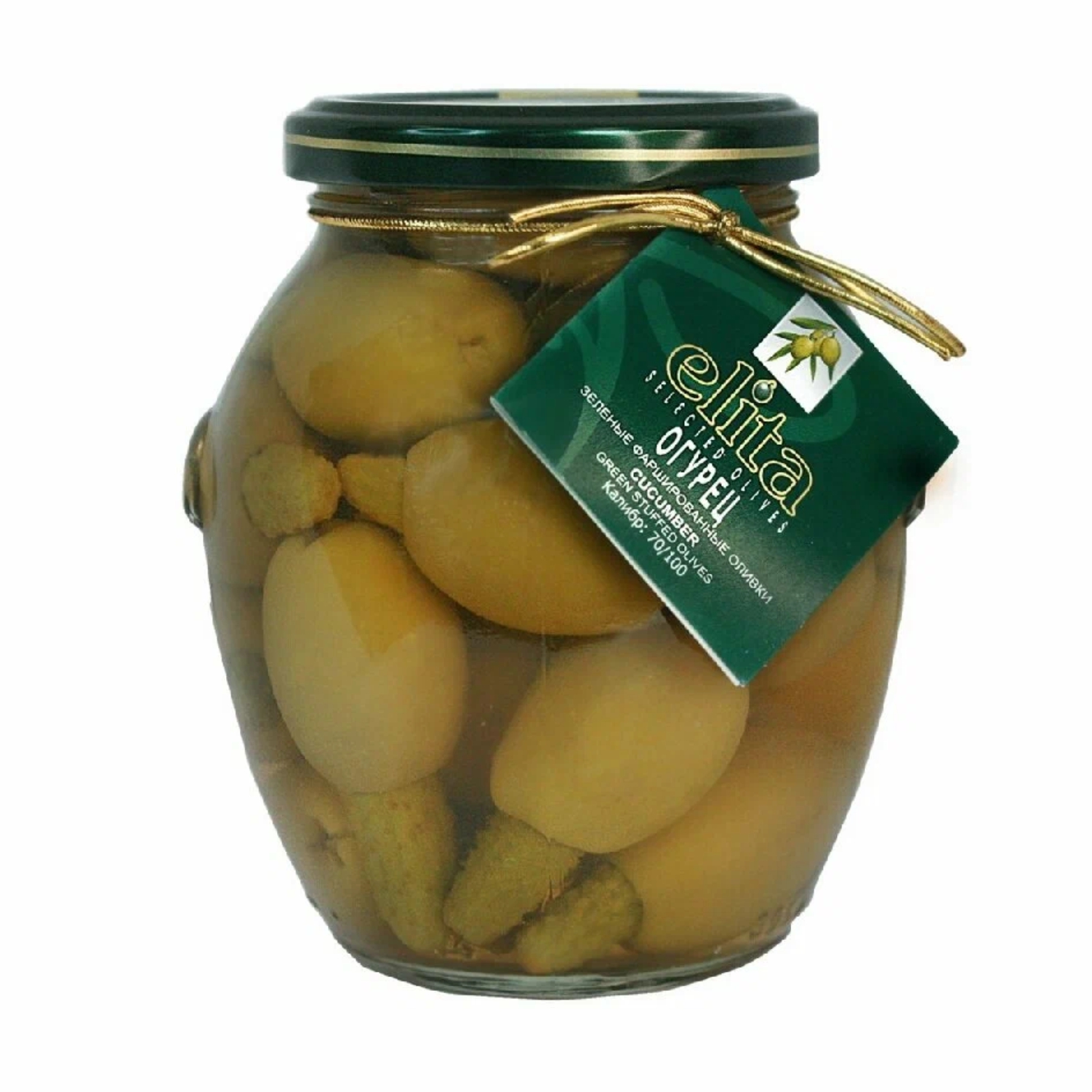 Оливки зеленые фаршированные корнишонами ELITA 395мл ст/б 1/6 Греция