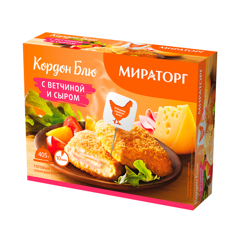 Кордон блю Мираторг с ветчиной и сыром 405г в аппетитной золотистой панировке приготовлены из отборного филе цыпленка с начинкой из плавленого сыра и свиной ветчины.