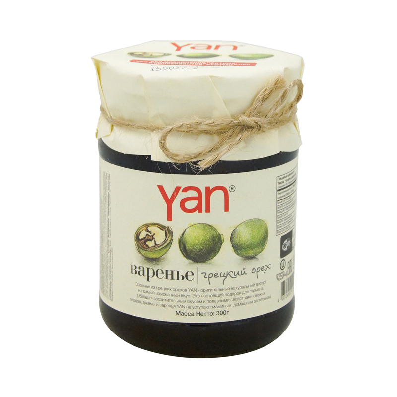 Варенье из грецких орехов называют «королем» сладкого мира. Грецкие орехи богаты линолевой и олеиновой кислотами витаминами С РР, группы В, содержат йод, магний, цинк, медь и фитонциды. Варенье Yan обладает необыкновенным вкусом и ароматом грецких орехов. Варенье из грецких орехов смело можно назвать деликатесным продуктом, который высоко ценится как «разборчивыми» гурманами на Кавказе, где оно очень популярно из-за обильного произрастания данных деревьев, так и далеко за пределами этого региона. В составе ядра присутствует немало ценных химических элементов: алкалоидов, гликозидов, смолянистых веществ и, самое главное, йода. Полезные свойства варенья из грецких орехов обуславливают его эффективность для повышения иммунитета, дополнительного лечения болезней щитовидной железы, а также для сосудов головного мозга.