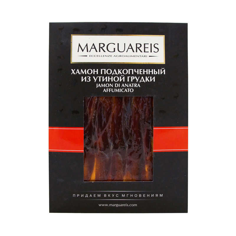 Вкуснейший деликатес подкопченный хамон нарезка из утиной грудки изготовленный по итальянской технологии, не оставит равнодушным ценителей гастрономических изысков. Классика хамона - игра на контрастном сочетании солености и сладкой дыни. Он очень хорошо сочетается с овощами: баклажанами, помидорами, цукини, цветной капустой, стручковой фасолью, а также с жаренным картофелем и пастой