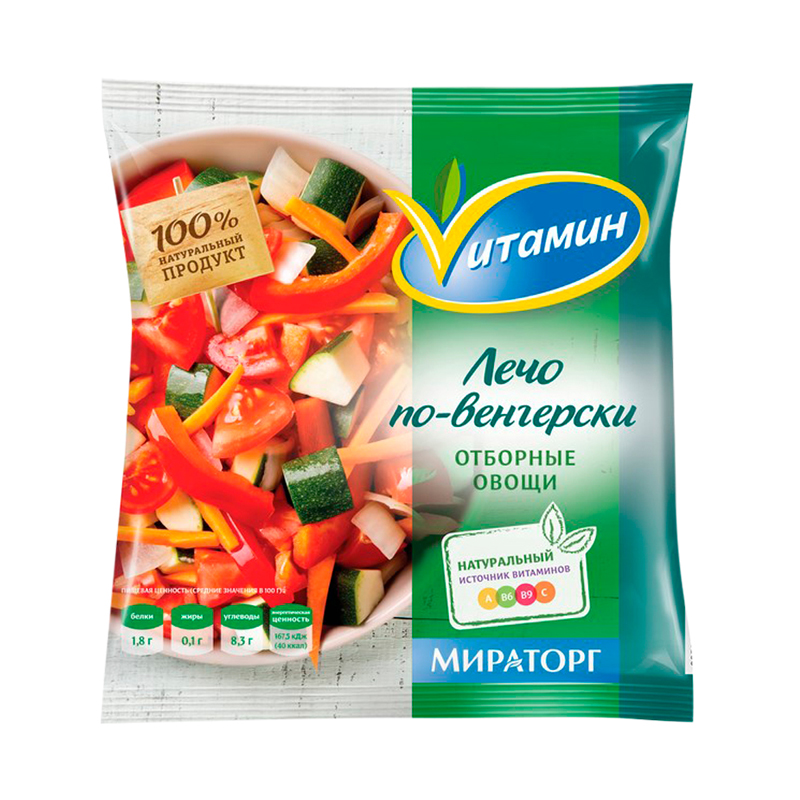 Лечо Vитамин по-венгерски быстрозамороженное 400г – это чудесный гарнир, а также сытное самостоятельное блюдо на обед или ужин! Лечо имеет приятный насыщенный овощной вкус, быстро и легко готовится и является богатым источником витаминов, минералов, клетчатки и других биологически активных веществ. Такой продукт незаменим в диетическом, спортивном и просто здоровом рационе. В составе лечо: томаты, цукини, сладкий перец, лук, морковь. Несомненным преимуществом быстрозамороженных овощей является то, что они, подвергаясь глубокой «шоковой» заморозке, на 95% сохраняют полезные свойства свежего продукта, просты в приготовлении и так же вкусны. При применении этой технологии не требуется никаких дополнительных, вредных для здоровья потребителя химических добавок. Таким образом, вы получаете вкусные натуральные овощи с внушительным сроком годности, которые можете приготовить в любое время года.
