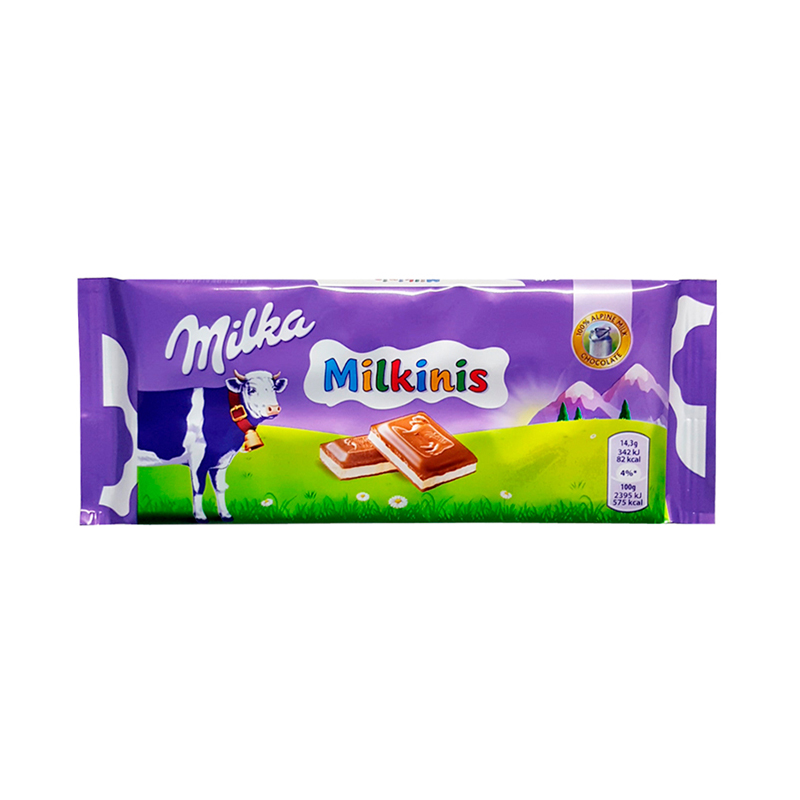 Milka Milkinis 100гр — шоколадная плитка из нежного альпийского шоколада и молочной прослойкой внутри, по вкусу напоминает палочки киндер.