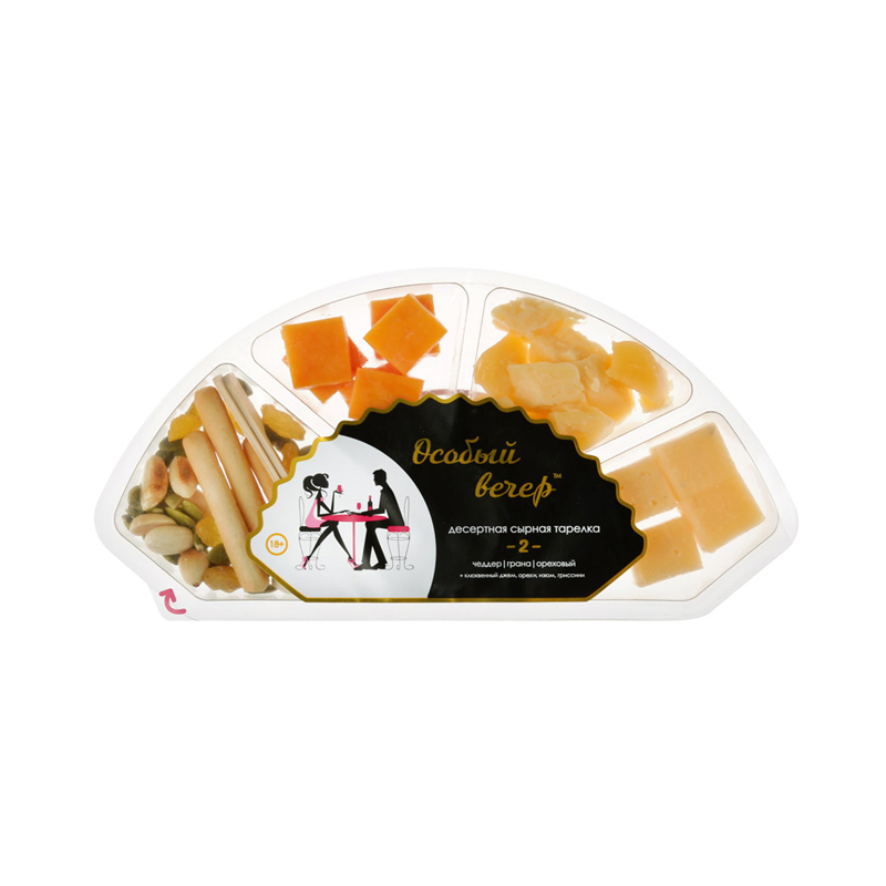 Сырная тарелка включает в себя три вида сыра: Чеддер, Грана и Ореховый. Все они аккуратно нарезаны на порционные кусочки и полностью готовы к употреблению. Кроме этого, в состав входят хлебные палочки «Гриссини», натуральный клюквенный джем, тыквенные семечки, арахис и изюм – в сочетании с этими ингредиентами сыр приобретет совершенно новые вкусовые оттенки. Подавайте в конце трапезы с бокалом игристого вина, чашечкой чая или крепкого кофе. Герметичная упаковка надежно сохраняет свежесть и органолептические свойства продукции в пределах всего срока годности. Все закуски ТМ «Особый вечер» отличаются безупречным качеством, отменным вкусом и привлекательным оформлением.