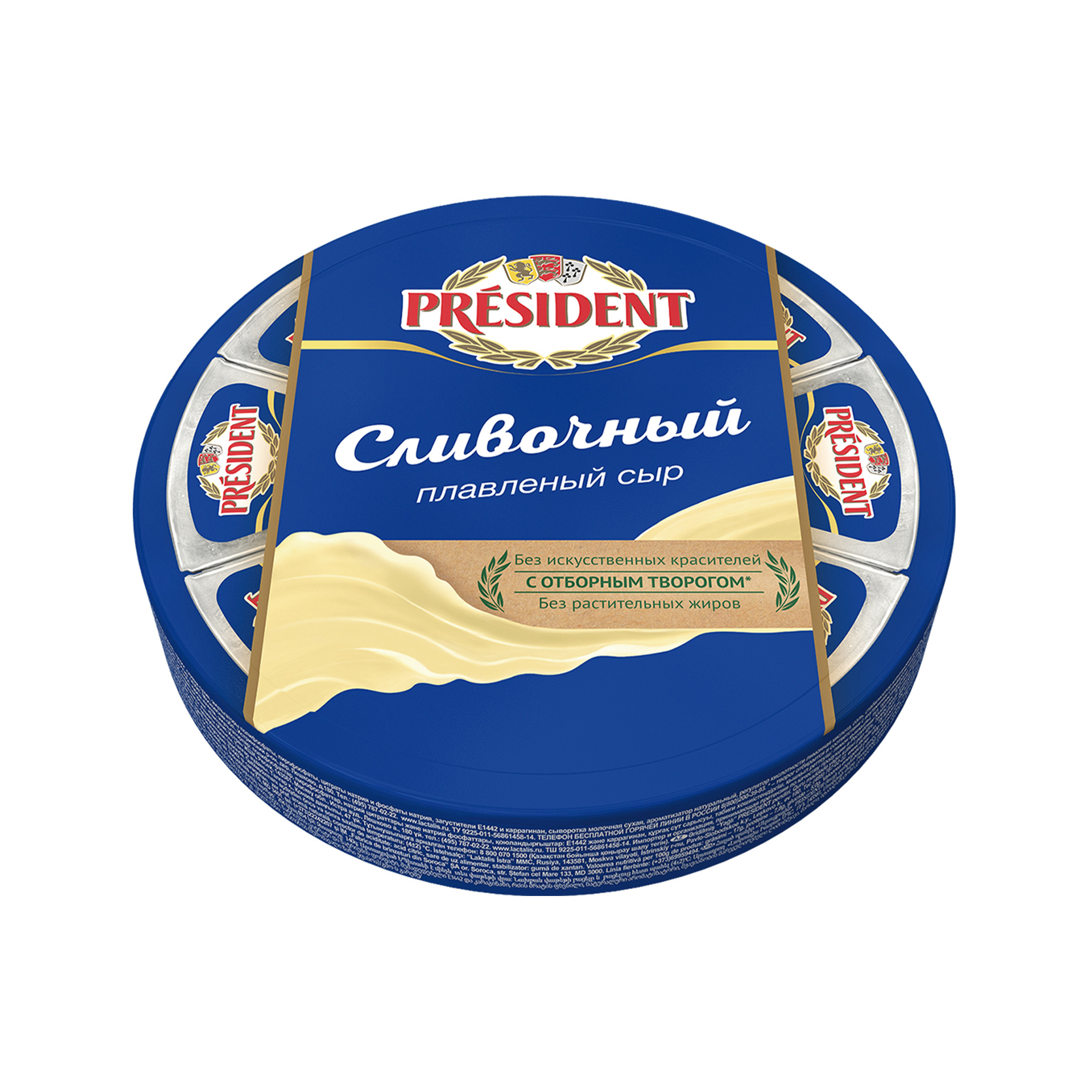 Плавленый сыр President «Сливочный» 45% обладает нежным сливочным вкусом и ароматом, а также мягкой кремообразной консистенцией. У него однородная текстура без комочков.