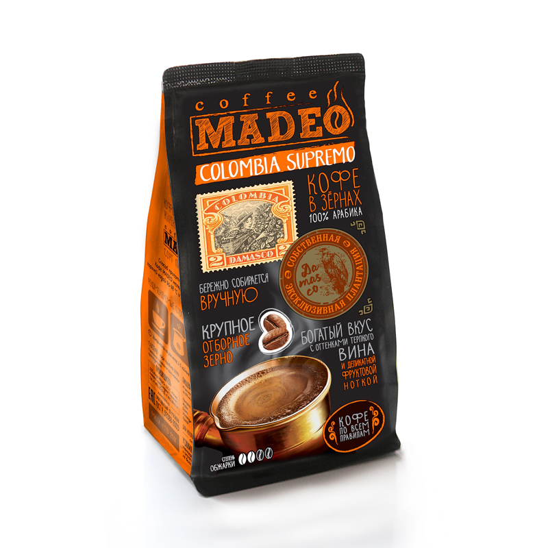 Эксклюзивный сорт кофе MADEO, выращенный на солнечных плантациях Колумбии. Яркий и насыщенный. Он является эталоном кофейного вкуса для многих кофеманов, за что и получил всемирную славу. Словно выдержанное дорогое вино букет его обладает терпкими благородными оттенками. Бодрость, полученная от этого кофе, приходит плавно, проясняет голову и повышает работоспособность. У него богатый вкус с оттенками терпкого вина и деликатной фруктовой ноткой. Всё благодаря отборному зерну и свежей обжарке.