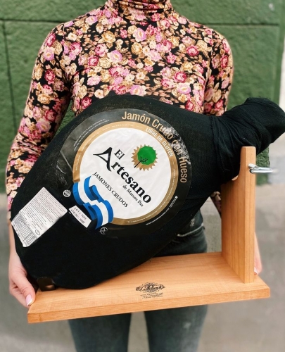 Целый окорок Хамона вместе с хамонерой (подставкой). Хамон - деликатес практически легендарный и всеми желанный, но немногие знают, что вкус его напрямую зависит от нарезки. И хамонера как раз поможет добиться идеальных ломтиков! Хотите впечатлить кого-то своим подарком? Приходите к нам в супермаркет "Деликатес"!